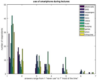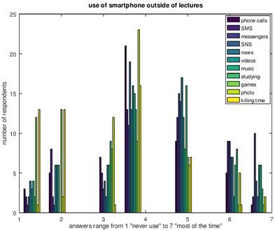As for use of smartphones outside of lectures, Fig.2 shows that most popular answers belong to such purposes as: taking photos, phone calls, checking SNS – “sometimes”; to check news, to study/do homework, to chat through instant messengers – “often”; to send SMS and chat through instant messengers both have high peaks in “very often” and “most of the time” responds.