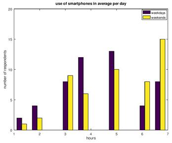 Next, we show results on the amount of hours students spend in average per day using their smartphones (separate on weekdays and weekends). According to Fig.3 majority of students spend more time with their smartphones on weekends: 7 hours and more – 15 respondents (29.41%), up to 6 hours – 8 respondents (15.69%), up to 5 hours – 10 respondents (19.61%); whereas high peaks on use of smartphones on weekdays are distributed as follows: up to 3 hours and 7 hours and more – equally, 8 respondents (15.69%), up to 4 hours – 12 respondents (23.53%), up to 5 hours – 13 respondents (25.49%).
