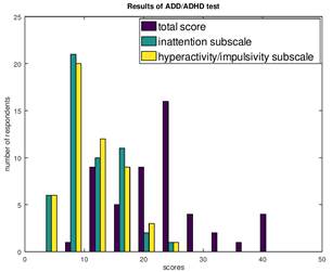 Finally, we approach to the results of part 2 and 3 of our survey. In part 2 students used a scientific test [13] to help determine if they have some symptoms of ADD or ADHD which include difficulty concentrating, keeping organized, impulsivity, and for some, hyperactivity. Developers of this test claim that this is not meant as a diagnosis tool but rather its results to be interpreted as recommendation to possibly seek further diagnosis from a trained mental health professional in order to rule out a possible attention deficit disorder. Therefore, we use results of this test for the purpose of measuring potential symptoms of ADD/ADHD. After completing the test, a person gets instant results in three numbers: total score, inattention subscale, and hyperactivity/impulsivity subscale. The results of two subscales together add to the total score. Fig. 6 illustrates results of the test with three scores.
