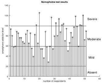 In the last part of our survey we employ nomophobia test [12] in order to measure level of smartphone addiction among students. Fig. 7 illustrates results of this test among the survey participants. Three horizontal lines on the stem graph are to separate four levels of smartphone addiction from Absent (with scores 0~20) to Severe (with scores 100~140). According to this test, more than half of students (27 respondents - 52.94%) have moderate level which (according to [12]) refers to the fear of not being able to access information; 13 students (25.49%) have mild dimension of nomophobia which refers to fear of losing connectedness; and 11 students (21.57%) are indicated as having severe level of smartphone addiction which in nomophobia dimension refers to “giving up convenience”.