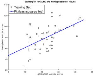 where q7_3 is the statement for students to rate from 1 (“never use”) to 7 (“most of the time”) – “How often do you use your smartphone during the classes for chatting through instant messengers”, NFT is nomophobia test result, and TOT is total score from ADD/ADHD test. Example visualization of one of the correlations (between TOT and NFT) is introduced in scatter plot in Fig. 8. Correlation coefficients r were calculated with a general Pearson’s correlation coefficient formula (1):